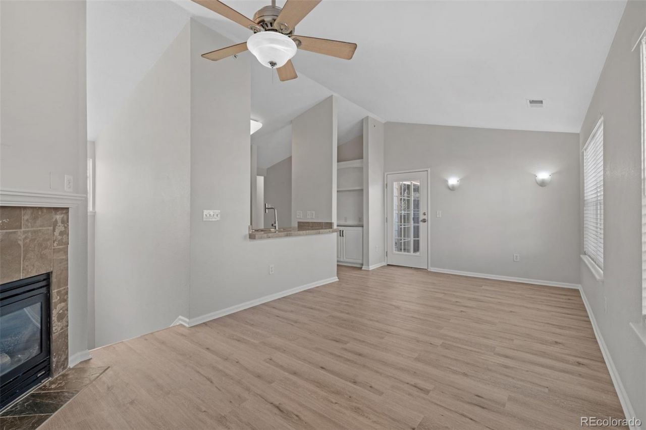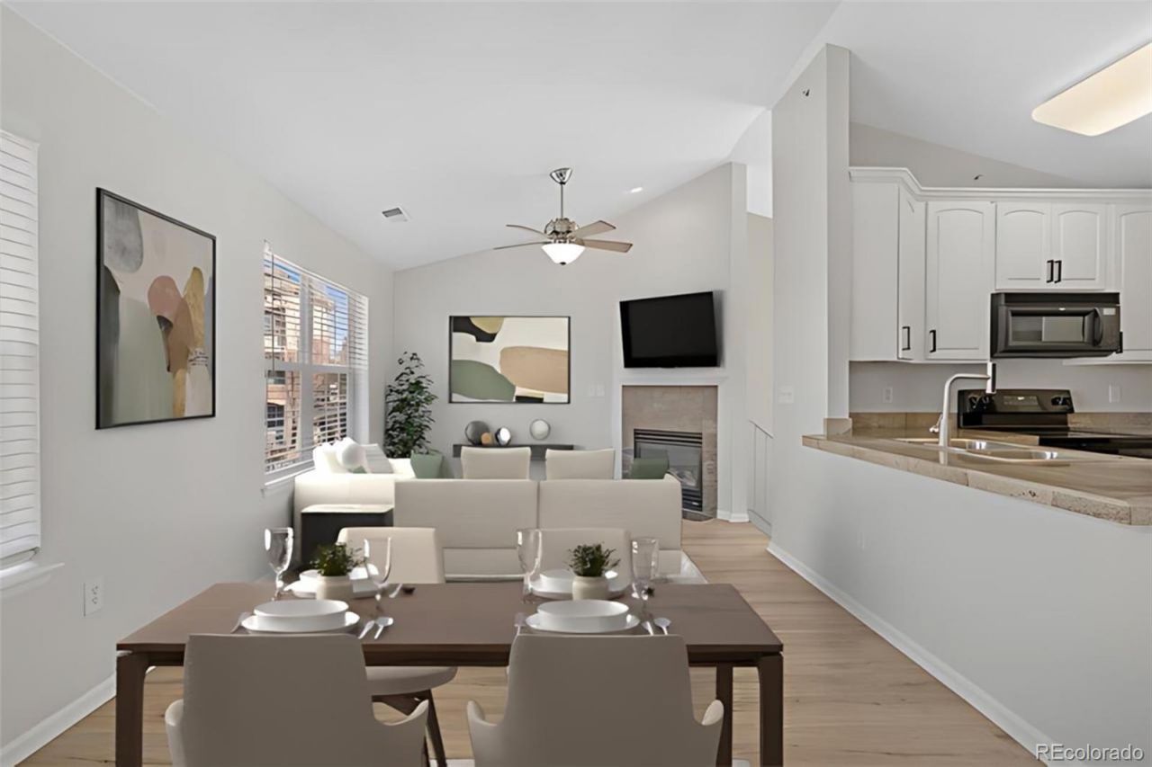 Dont miss this rare opportunity to own a coveted end-unit, with no attached neighbors, in Town Center Terrace with a convenient attached garage! This spacious two bedroom, two bath home has been beautifully updated throughout. Updates include: new floors throughout, new paint, new kitchen updates (including new cabinet hardware, new faucet, dishwasher 2023, oven/stove 2025), new toilets, new window blinds throughout, water heater in 2019, and furnace / AC both new in 2021. The main living area boasts an open floor plan, cozy gas fireplace, vaulted ceilings, new wood laminate floors and plenty of natural light. From the living area, there is direct access to the balcony overlooking the pool! The super clean black and white kitchen shines with beautiful tile countertops, new floors, and ample wood cabinetry. The large primary suite offers a private full bath with dual sinks, custom built-ins, and a generous walk-in closet. The second bedroom is a perfect bedroom or a home office. It has a great closet and a huge slider with access to the second floor balcony overlooking the pool. The washer and dryer in the main floor laundry closet are included. Located in the highly sought-after Cherry Creek School District, this home offers easy access to the Dayton Light Rail Station (one block away!), Cherry Creek Reservoir Park (less than one mile walk), major highways, and the Denver Tech Center (DTC), making your commute a breeze. This quiet, well-maintained community includes amazing amenities such as a pool, hot tub, community clubhouse, and fitness center. Schedule your private tour today!